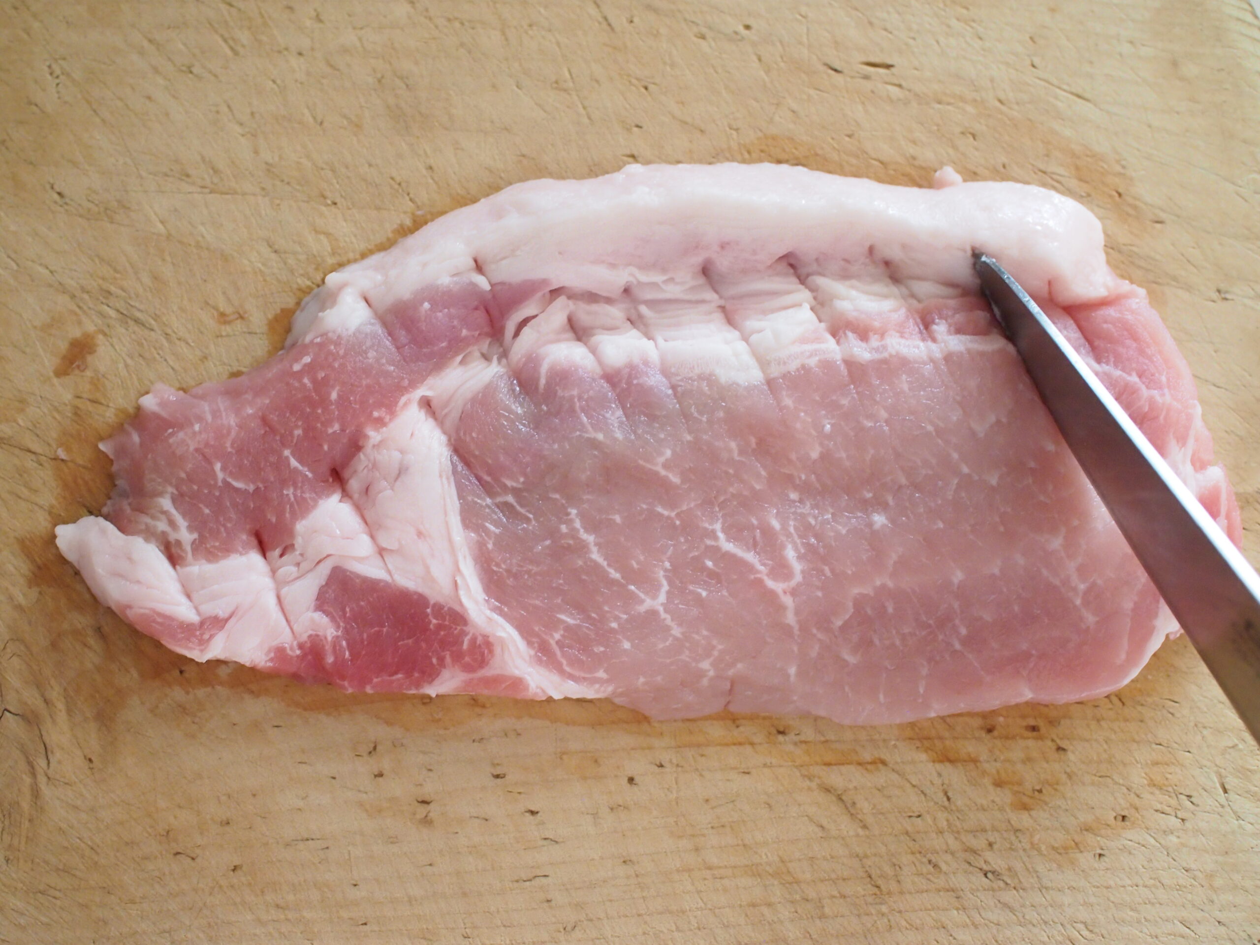 ①豚ロース肉は脂肪と赤身の間に1cm間隔くらいで包丁を入れ、筋切りする。