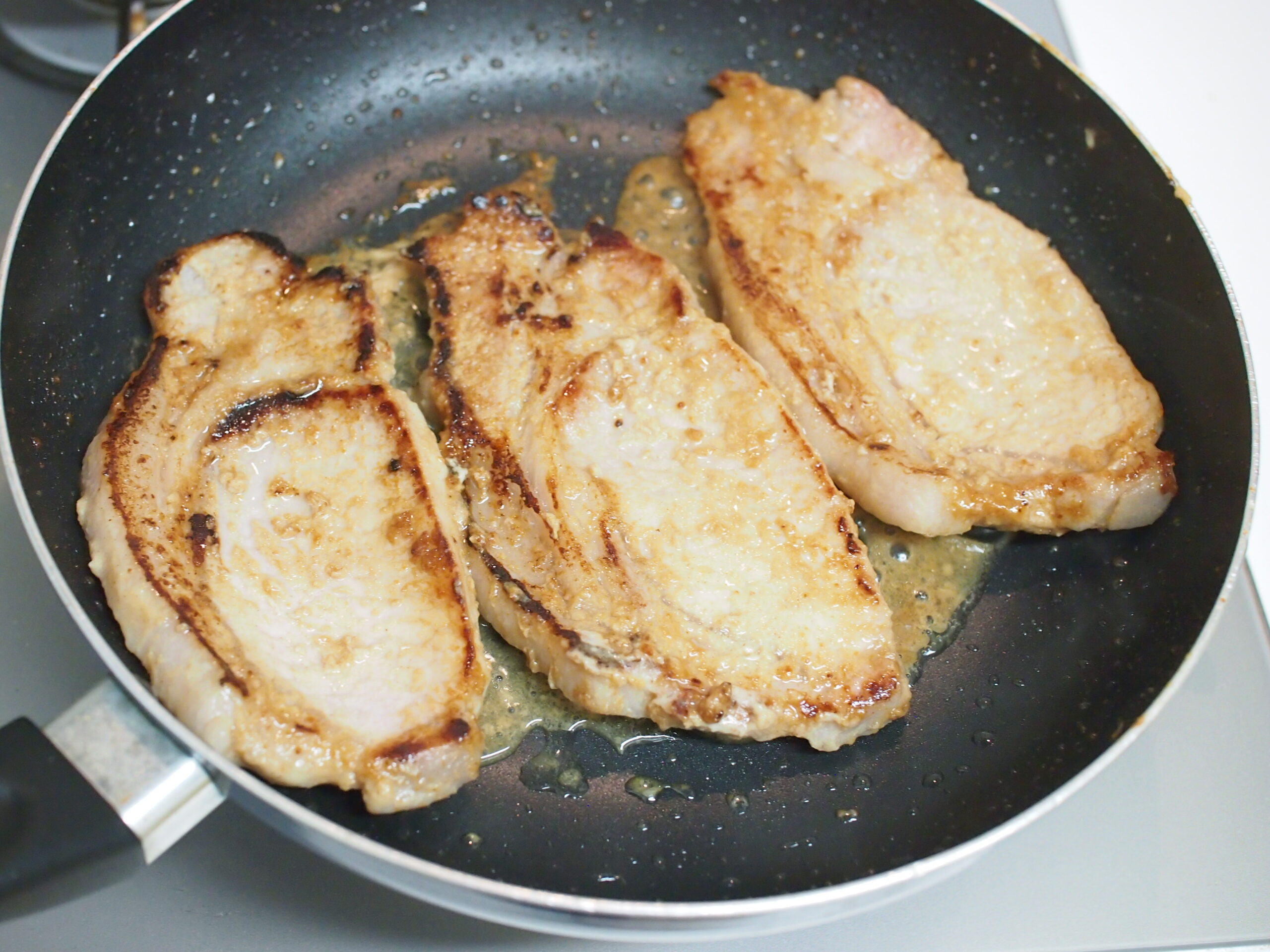 ④フライパンにサラダ油少々を熱し、豚肉を入れて中火でおいしそうな焦げ目がつくまで焼き、裏返して中まで火を通せば完成!