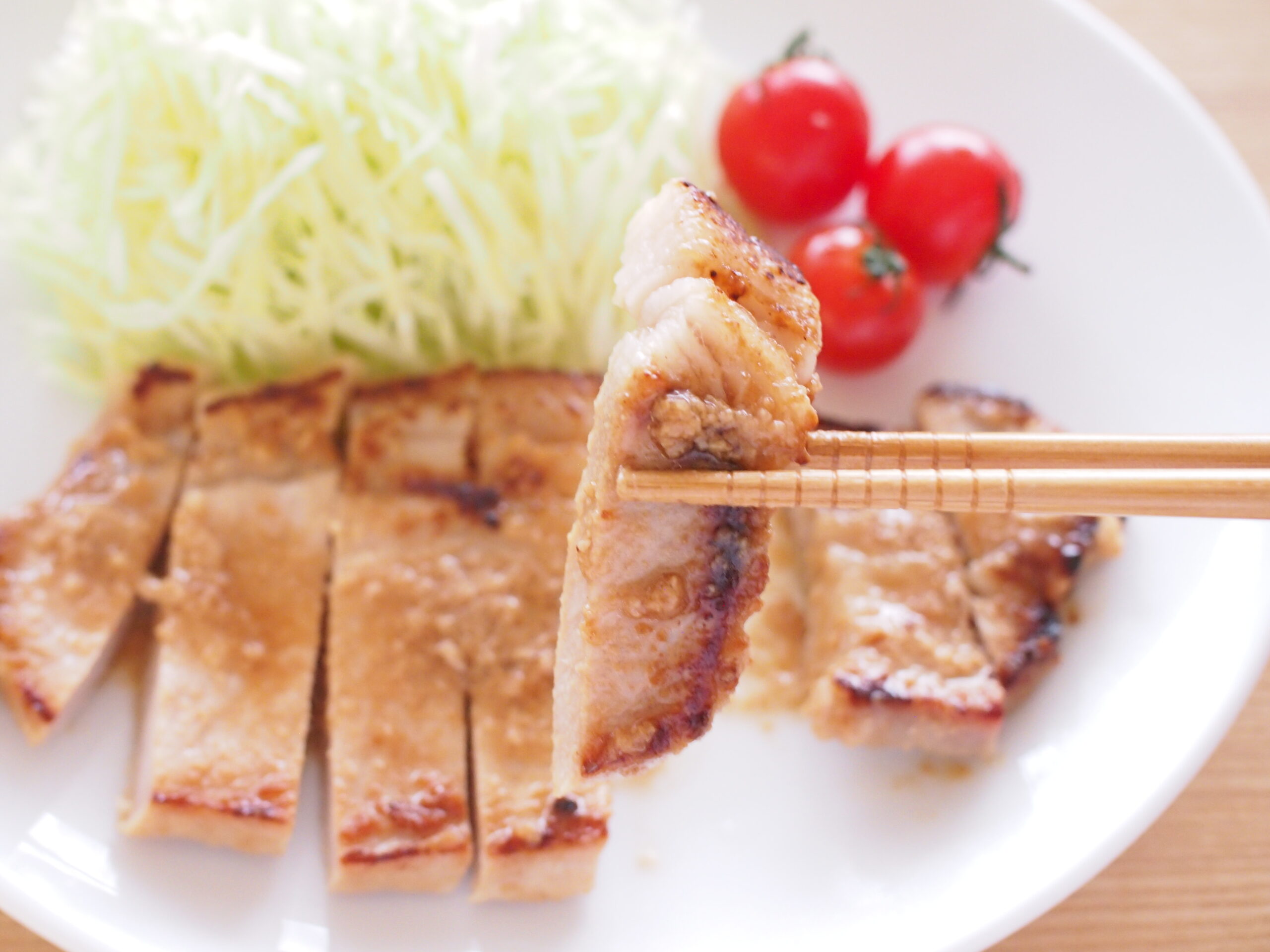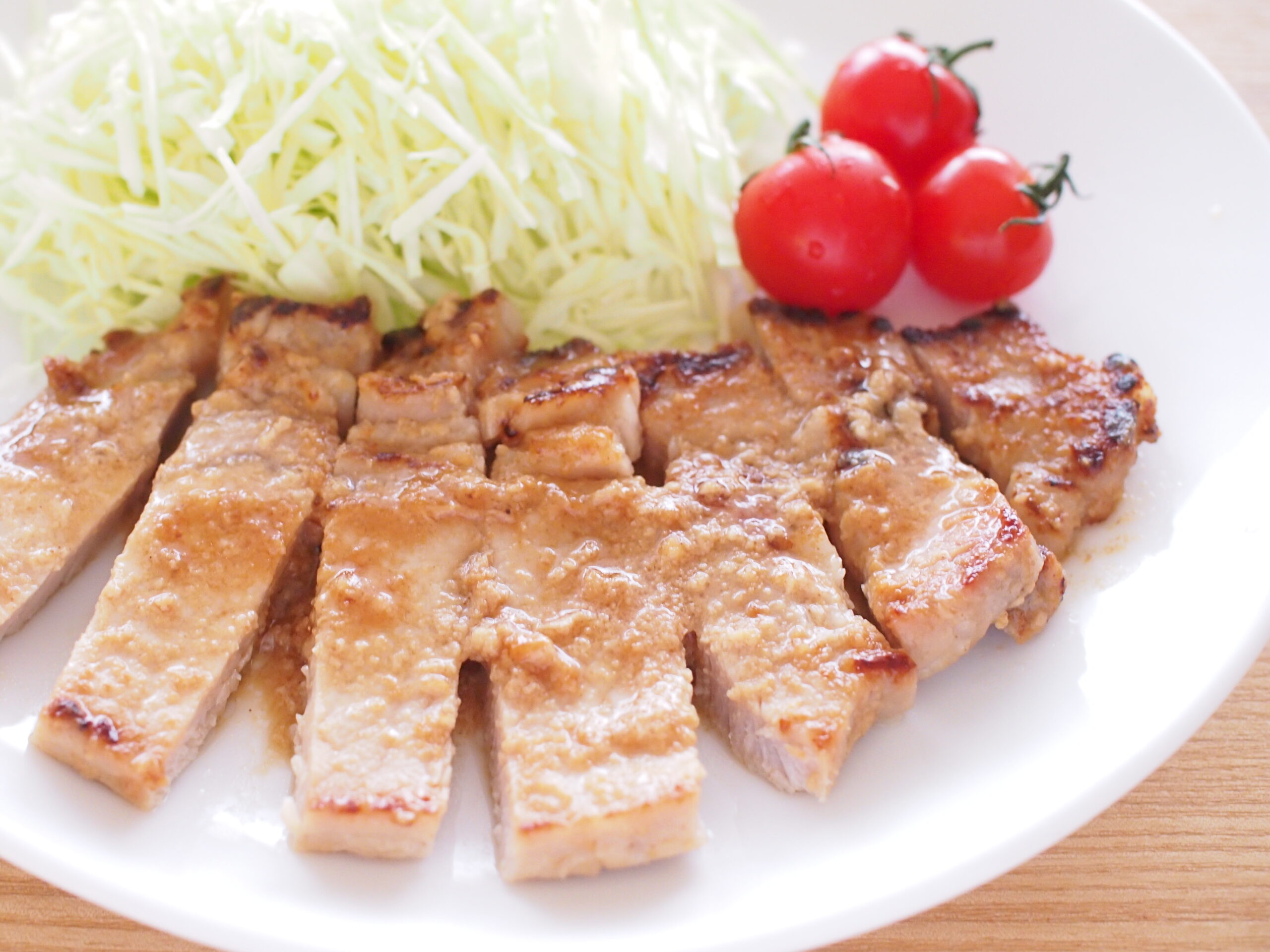こちら、とんかつ用の豚肉が安売りされていると高確率で作る、家族も大好きなおかず。「豚ロース肉のみそ漬け焼き」です。