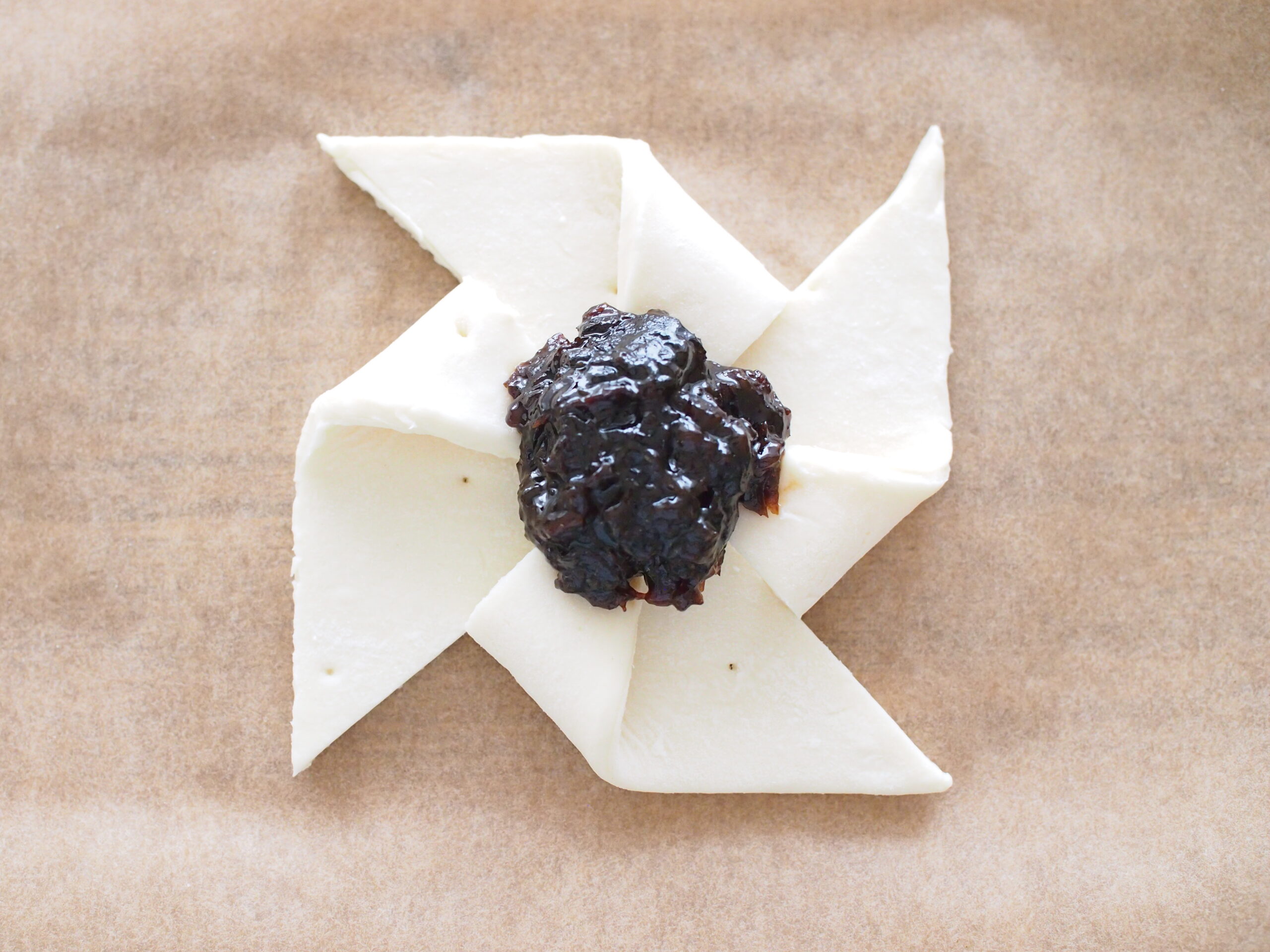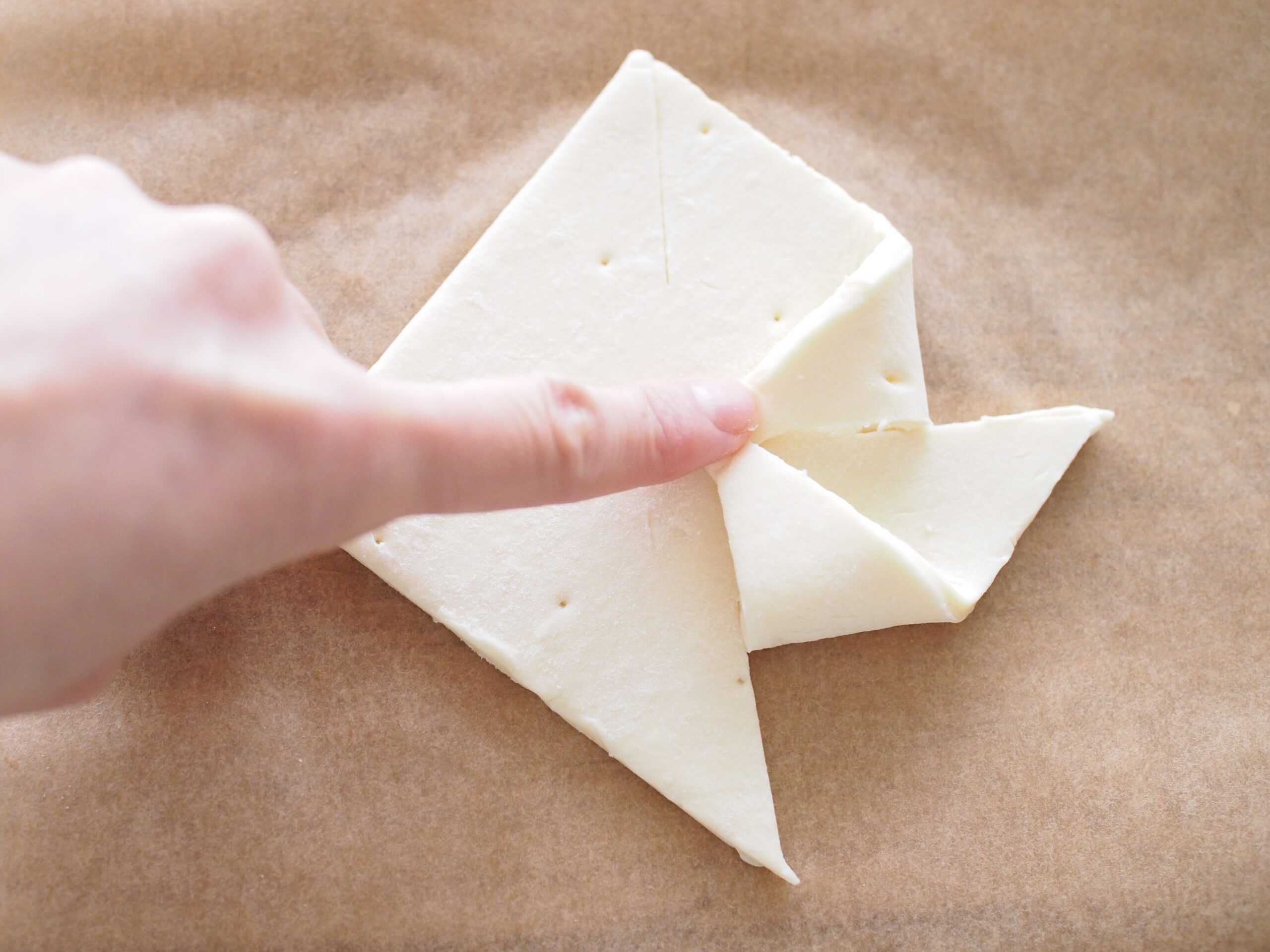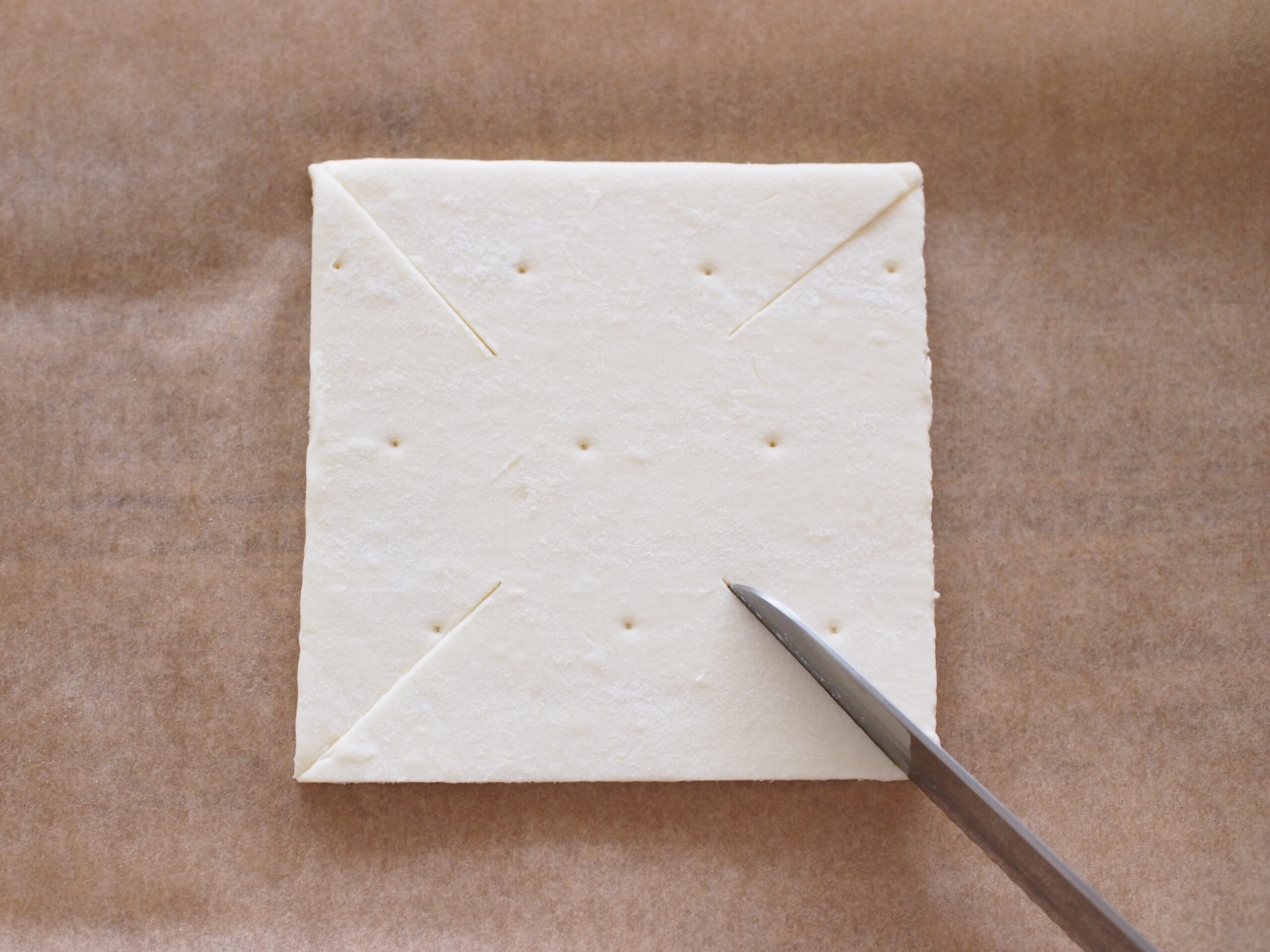 ②パイシートは半解凍し、4枚の正方形になるように切る。四隅の角に4㎝ほどの切れ目を入れ、片方の生地の端を中心に向かって折り込み、指で軽く押さえる。