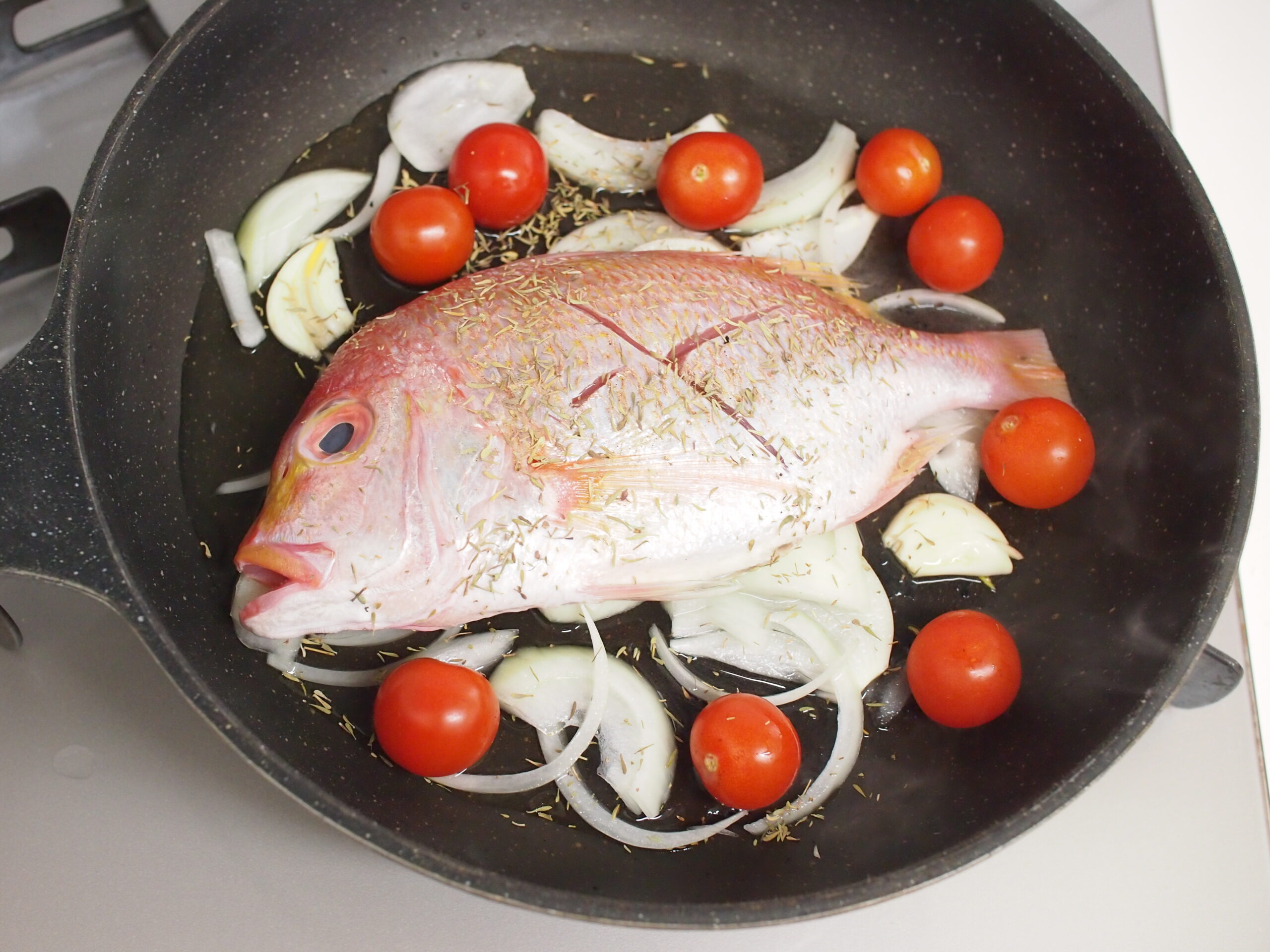 ③フライパンに玉ねぎを敷き、鯛を上にのせる。周りにトマトとにんにくを散らし、白ワイン、オリーブオイル、ハーブを加えて強火にかける。