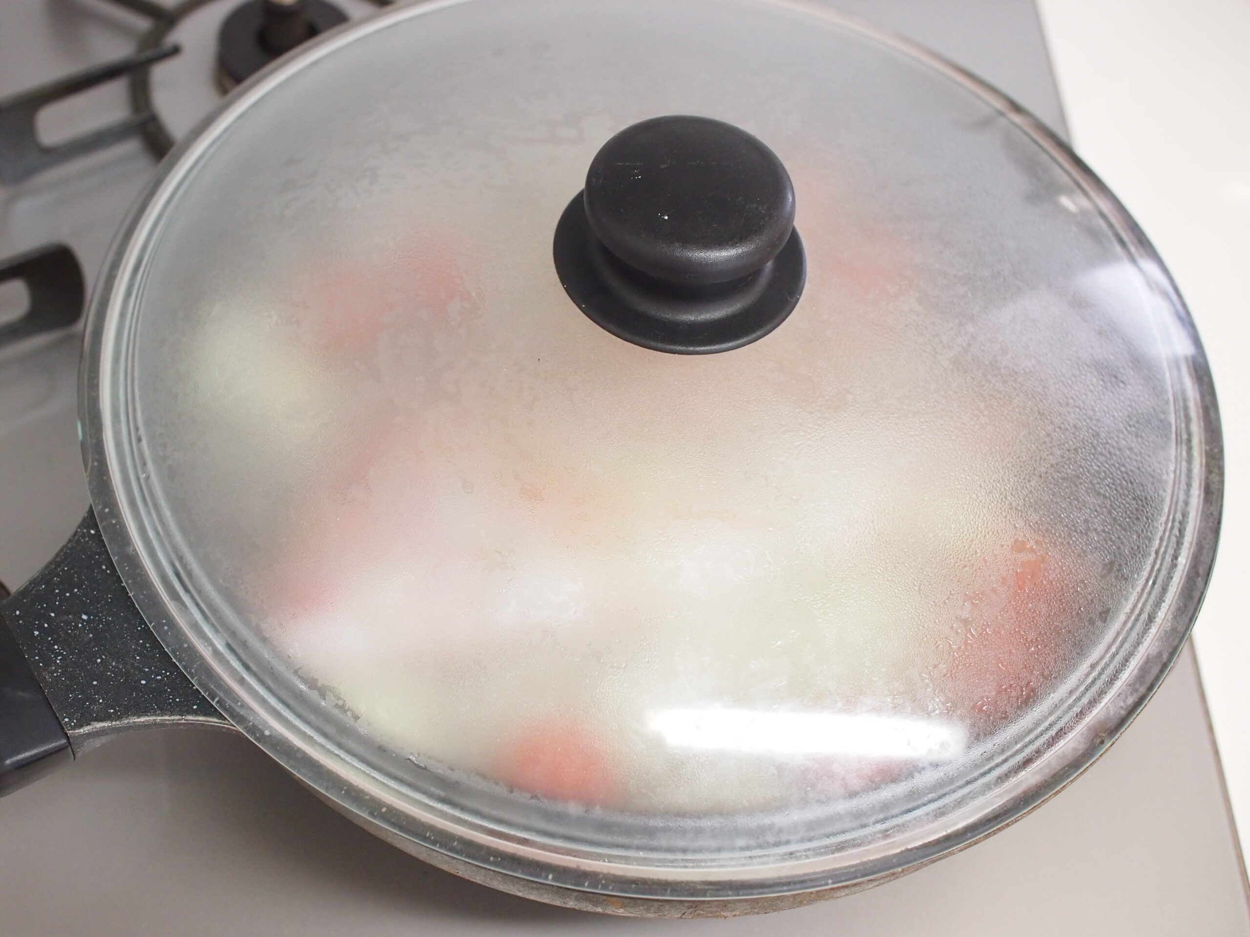④沸騰したら弱めの中火に落とし、蓋をして8分ほど蒸す。