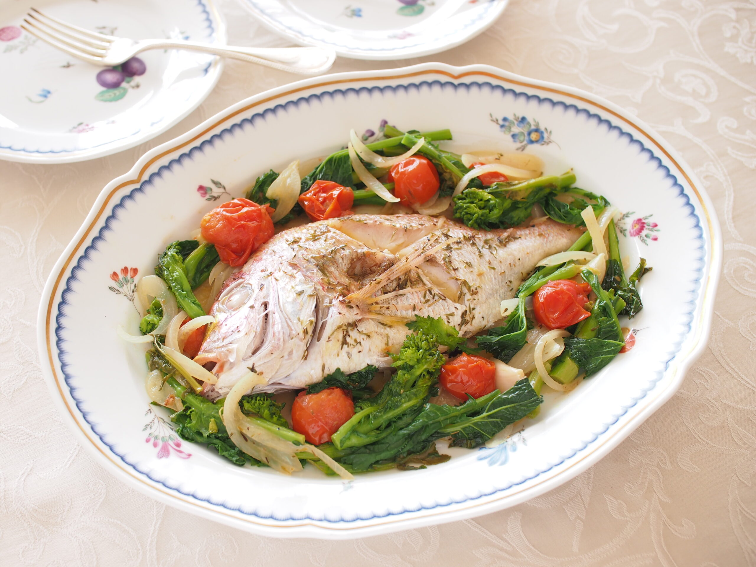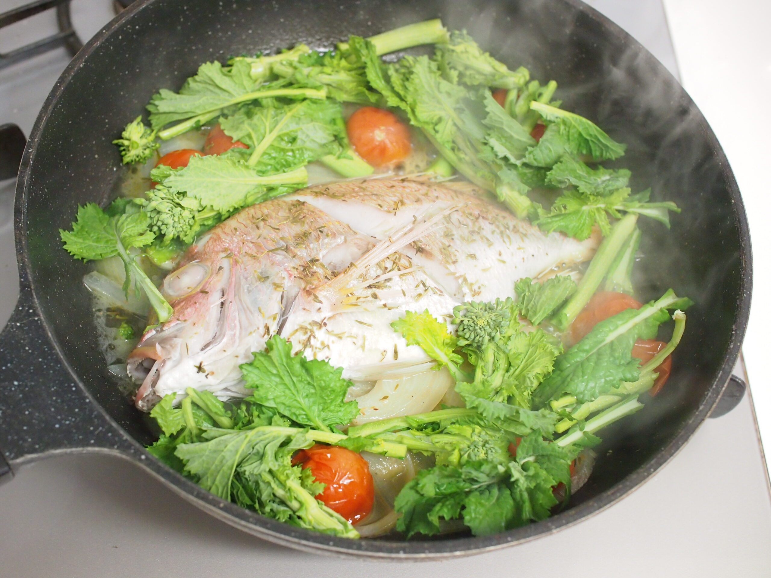 その連子鯛と旬の菜の花を使って、今回はシンプルなイタリア風白ワイン煮を作りました。フライパンに材料を放りこむだけであーっという間にご馳走が完成!