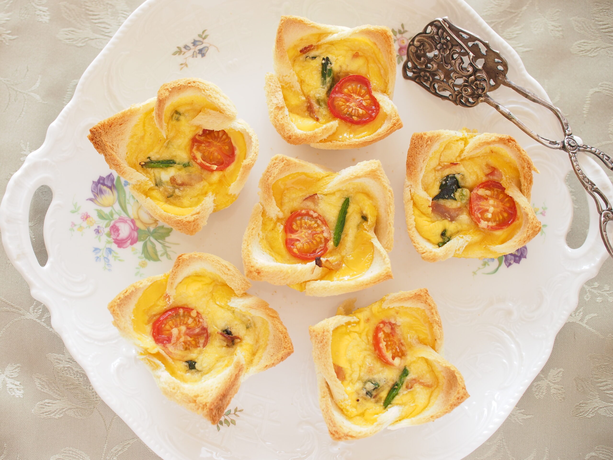 パイ生地ではなく食パンを使いマフィン型で焼き上げる簡単キッシュ。中身はほうれん草、玉ねぎ、トマト、ベーコンでキッシュロレーヌ風です。