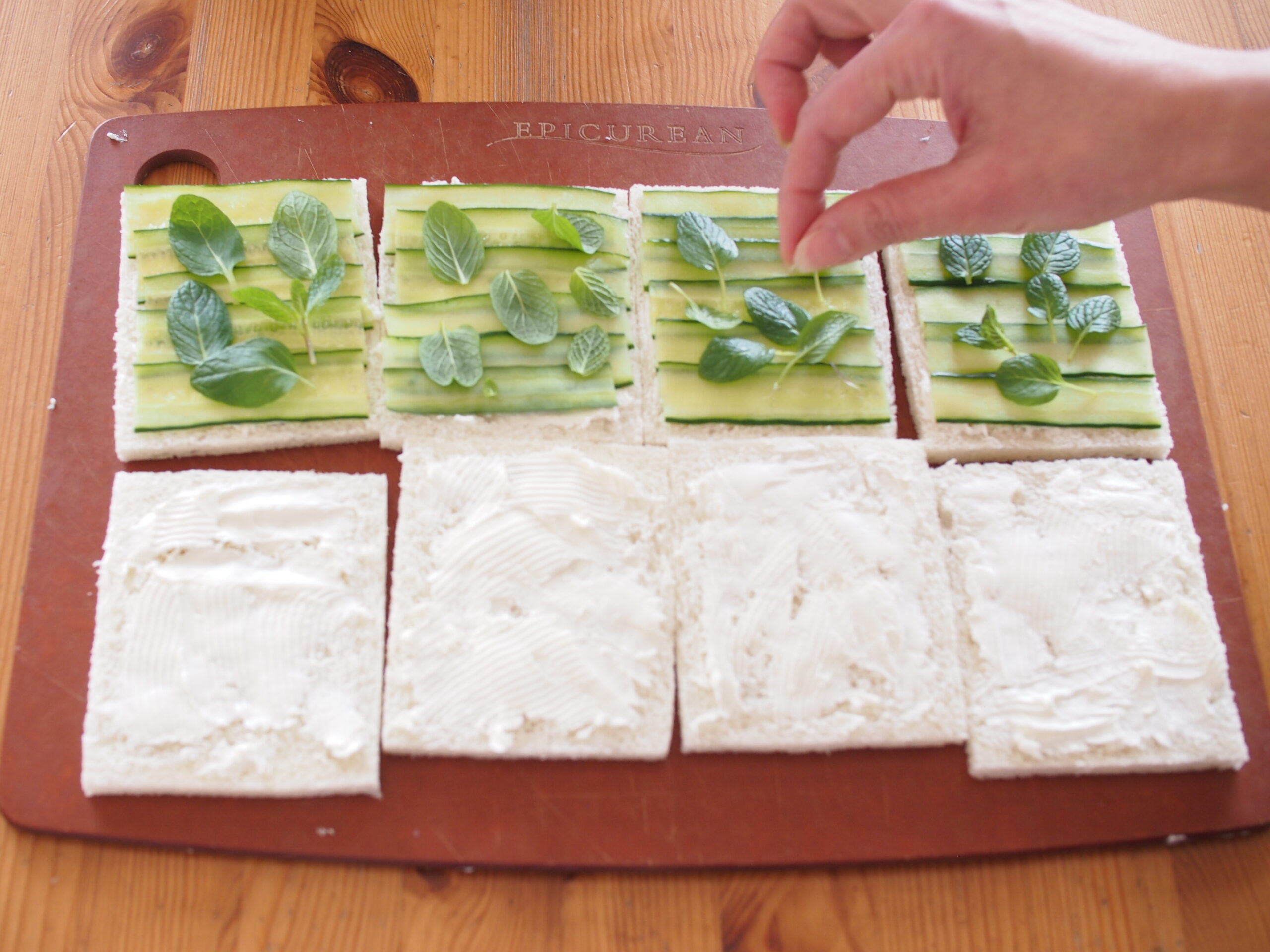 イギリスのアフタヌーンティに欠かせないきゅうりのサンドイッチ。クリームチーズをたっぷりと塗り、ミントをこれもたっぷりと挟んで爽やかに。