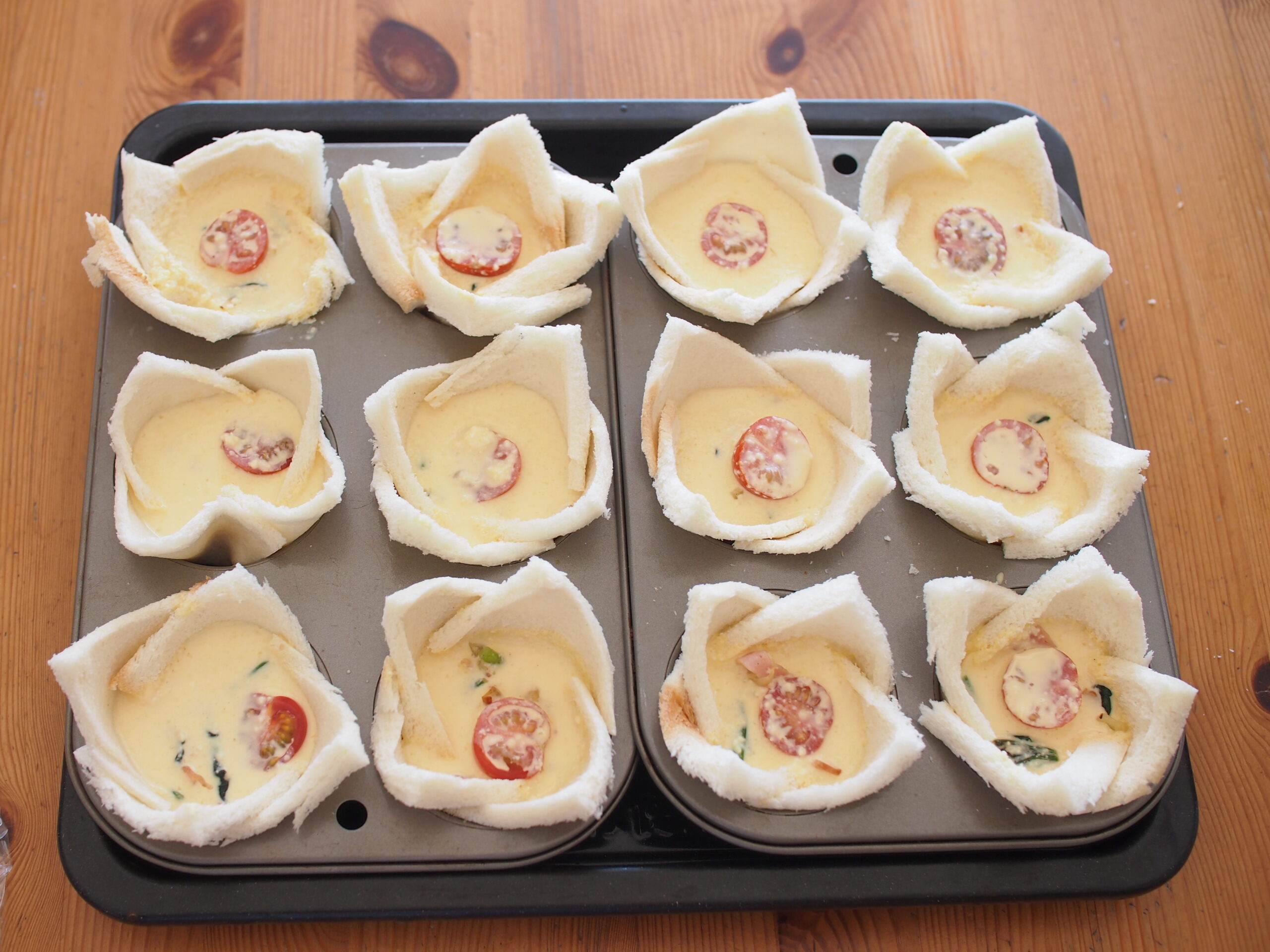 食パンを使ったミニパンキッシュを焼く前の図。パイ皮と違って温度管理を気にしなくてよいですし、口当たりも軽いのがうれしいレシピです。