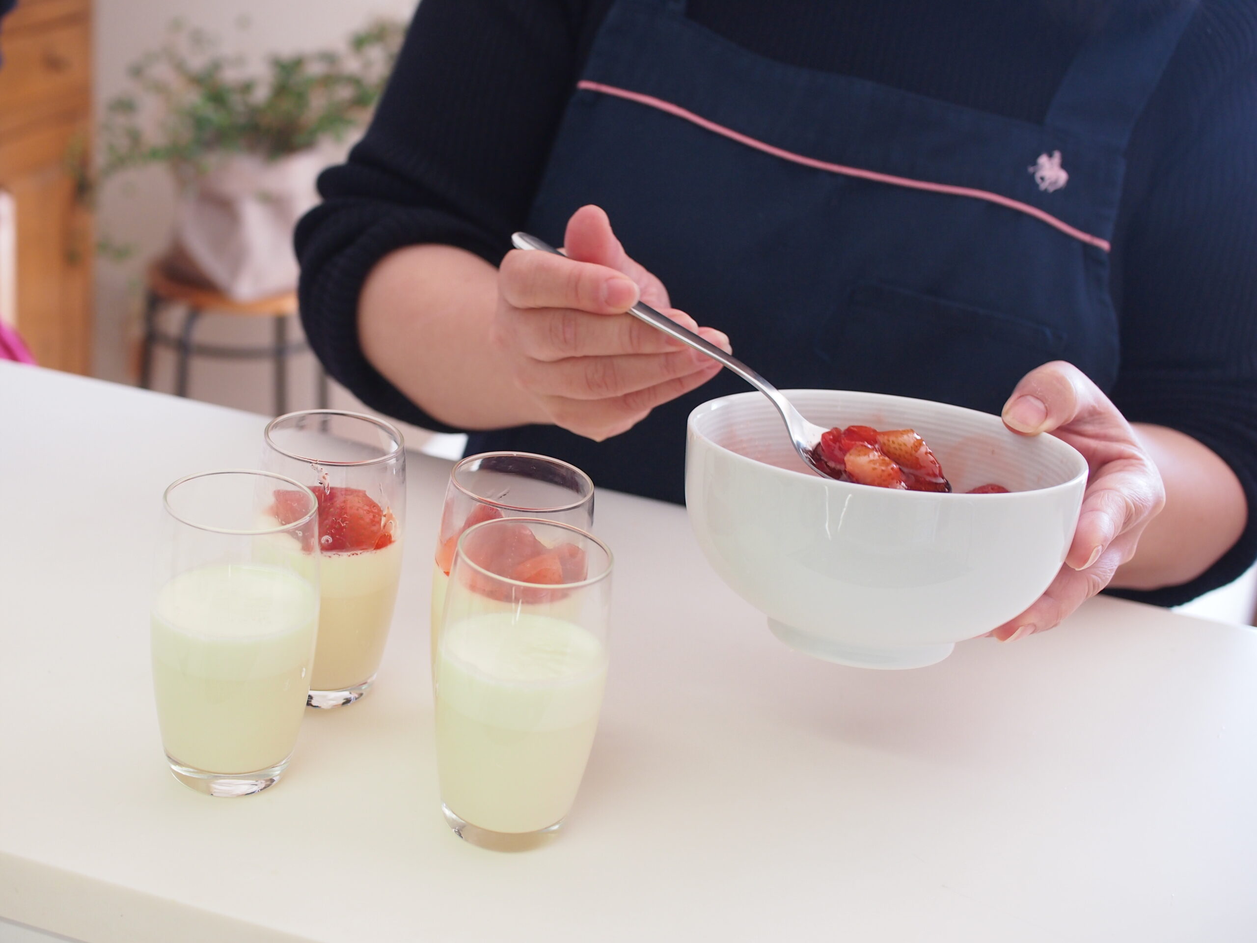 甘さ控えめの豆乳パンナコッタには、レンジで即席で作るいちごソースをたっぷり注いで♪