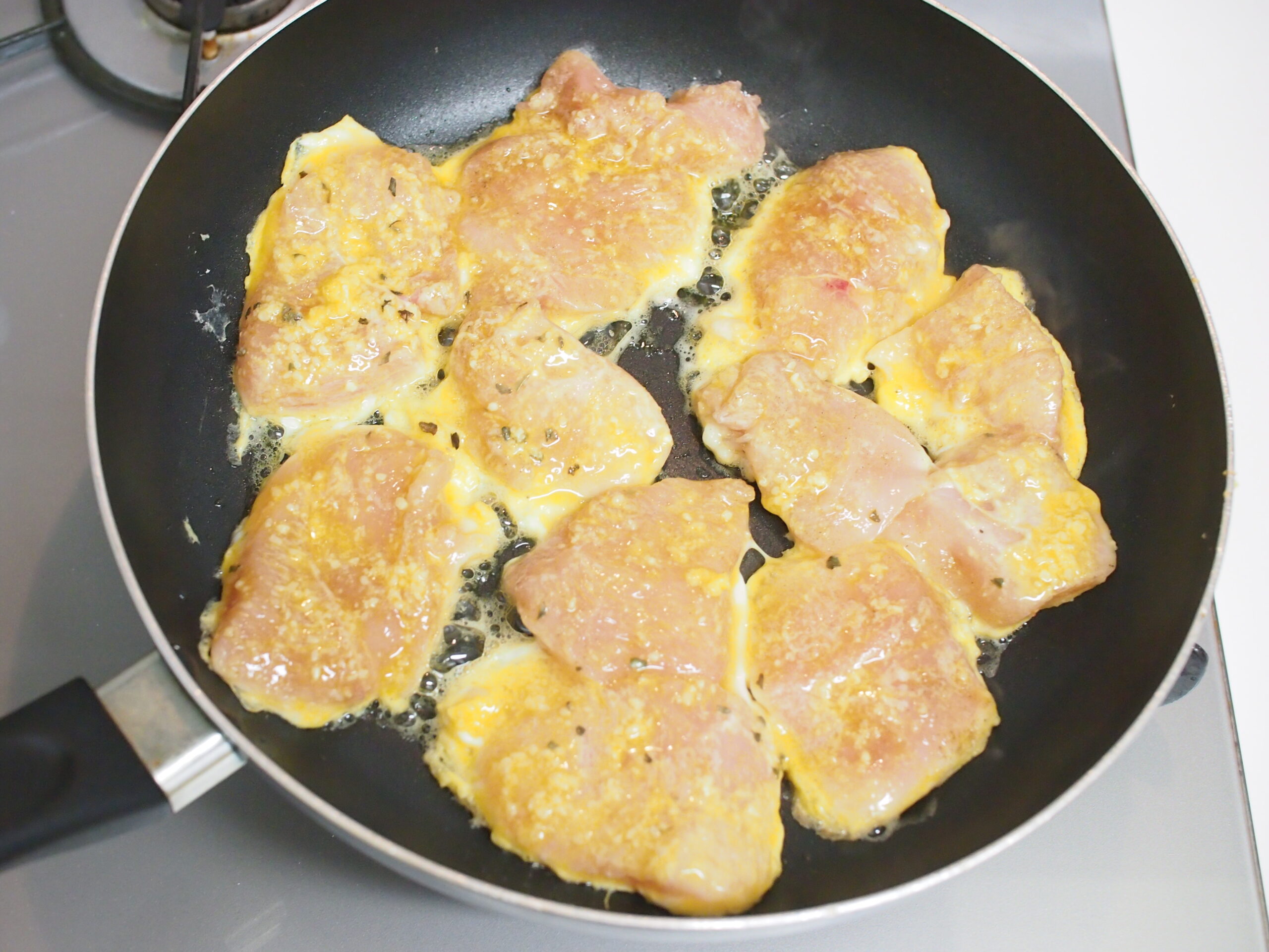 ③卵にパルメザンチーズを混ぜた卵液にくぐらせ、オリーブオイルとバターを熱したフライパンで両面を焼けば完成!