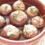 ②マッシュルームは汚れをペーパーでふき、軸を手でひねって取る(又はスプーンでかき出す)。くぼみに①を詰める。
