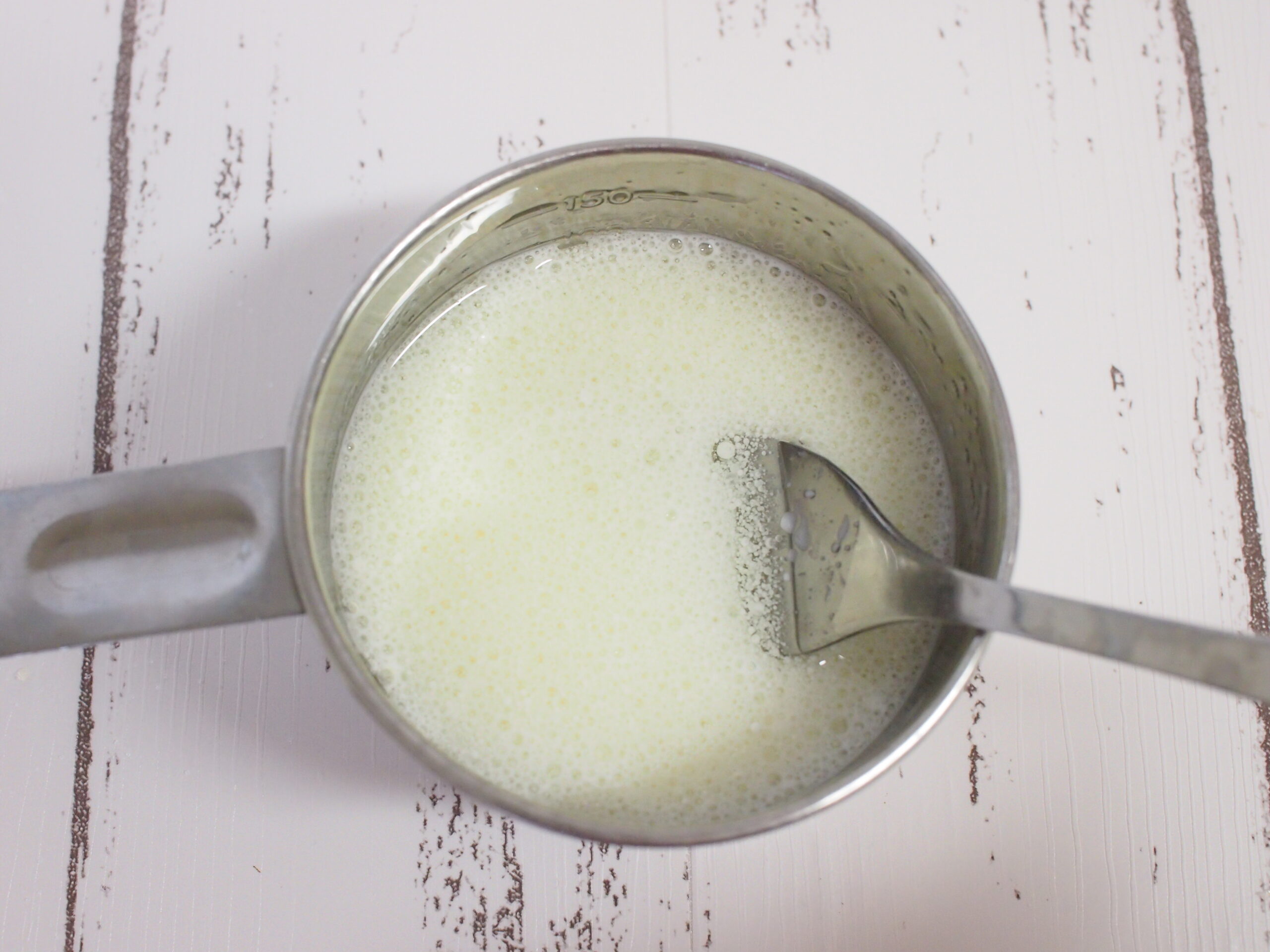 ①牛乳とサラダ油をフォークでよく混ぜる。