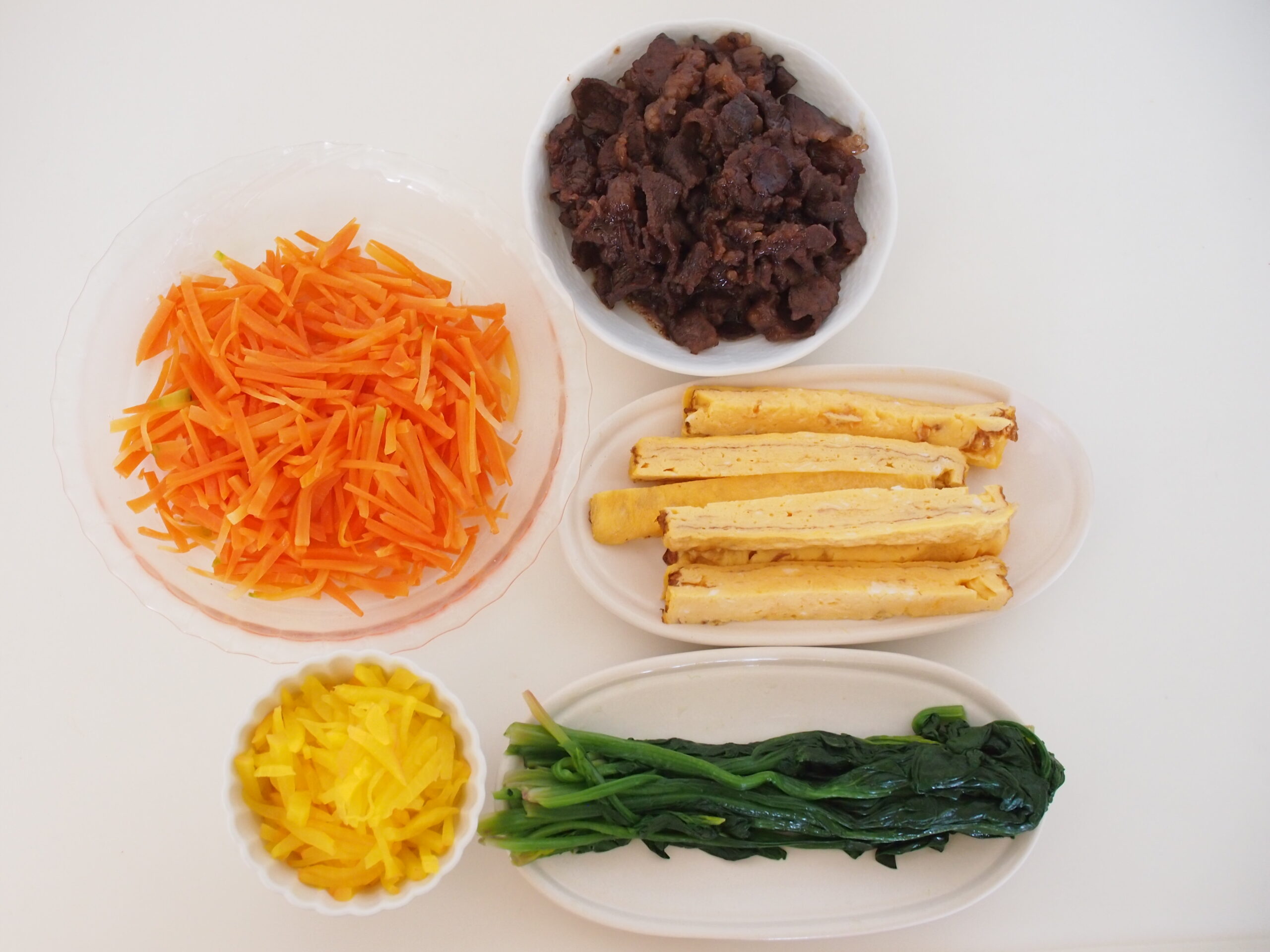 具は甘辛い牛肉、にんじんのナムル、ほうれん草のナムル、卵焼き、たくわんと具だくさん!味わいも深く色合いもカラフル&華やかです。