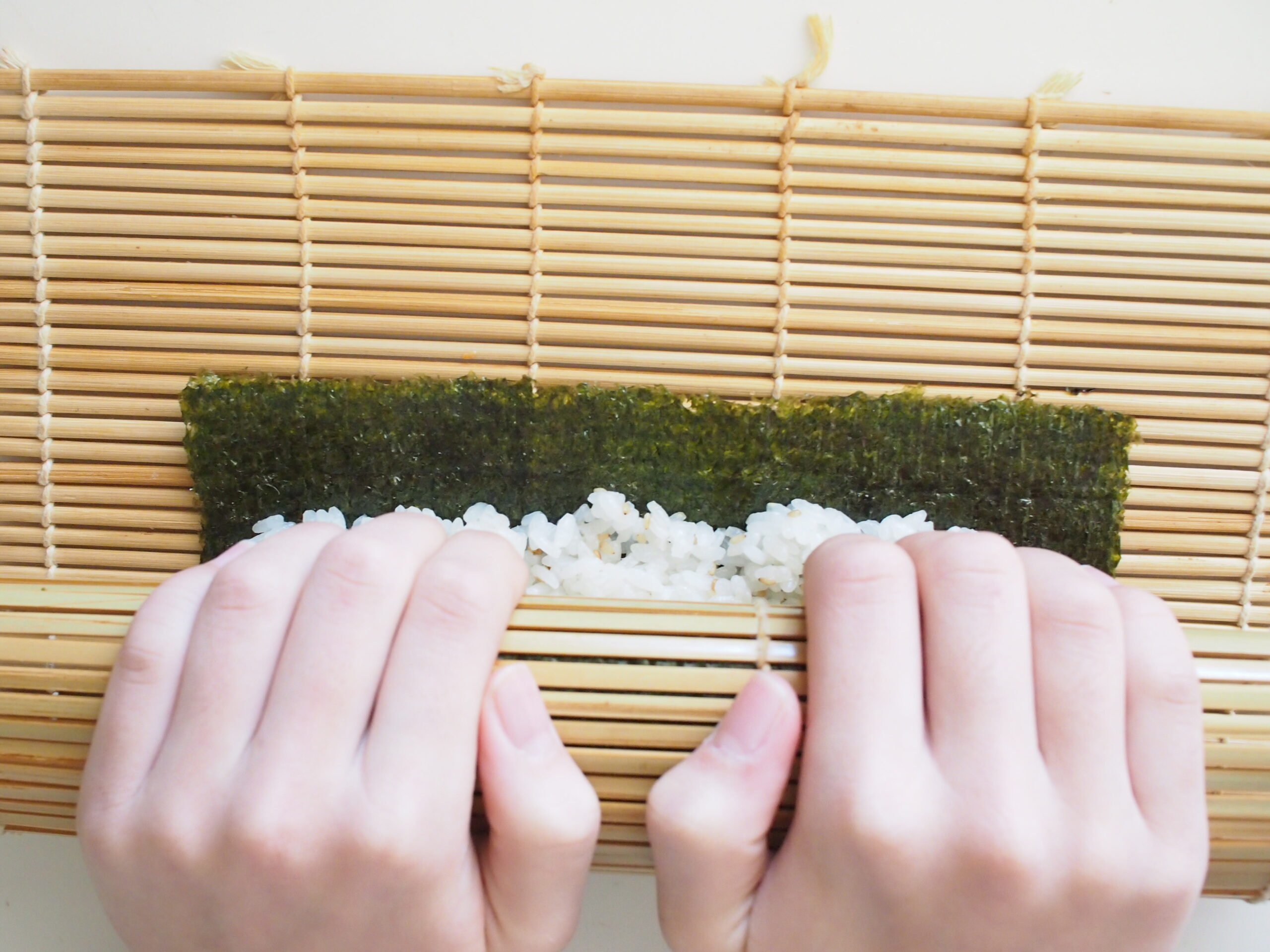④上部のごはんの中央に着地するようにまず1回転巻く。とじ目を内側にぎゅっと押し込み、巻きすを向こう側に引っ張りながら最後まで巻く。