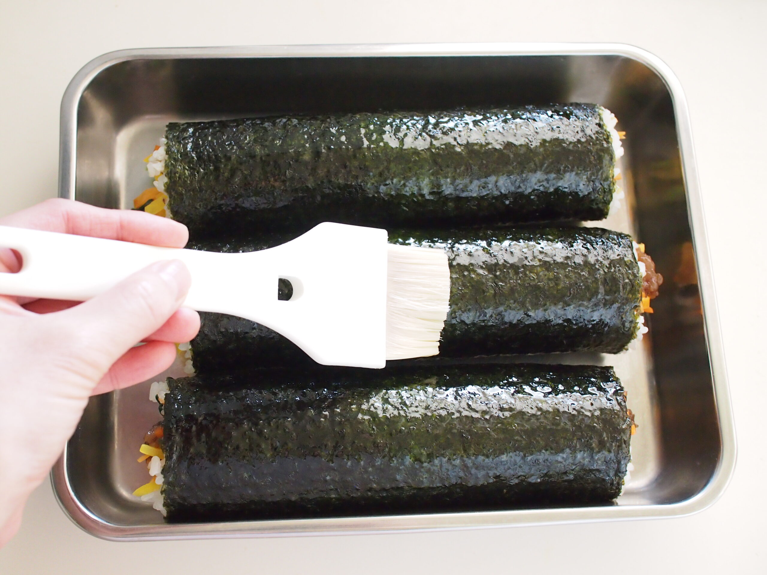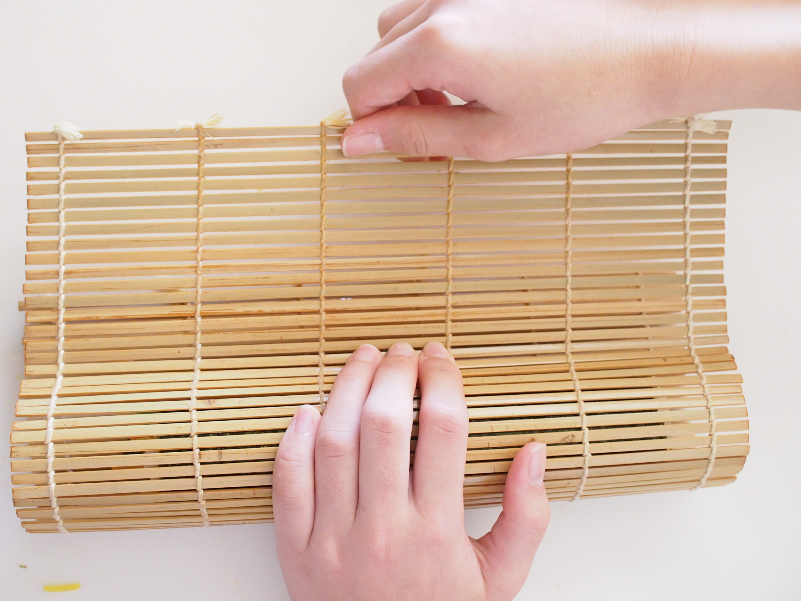 ⑤巻き終わったら巻きすごと全体を押さえて形を整え、とじ目を下にした数分置く。残り2本も同じように巻く。