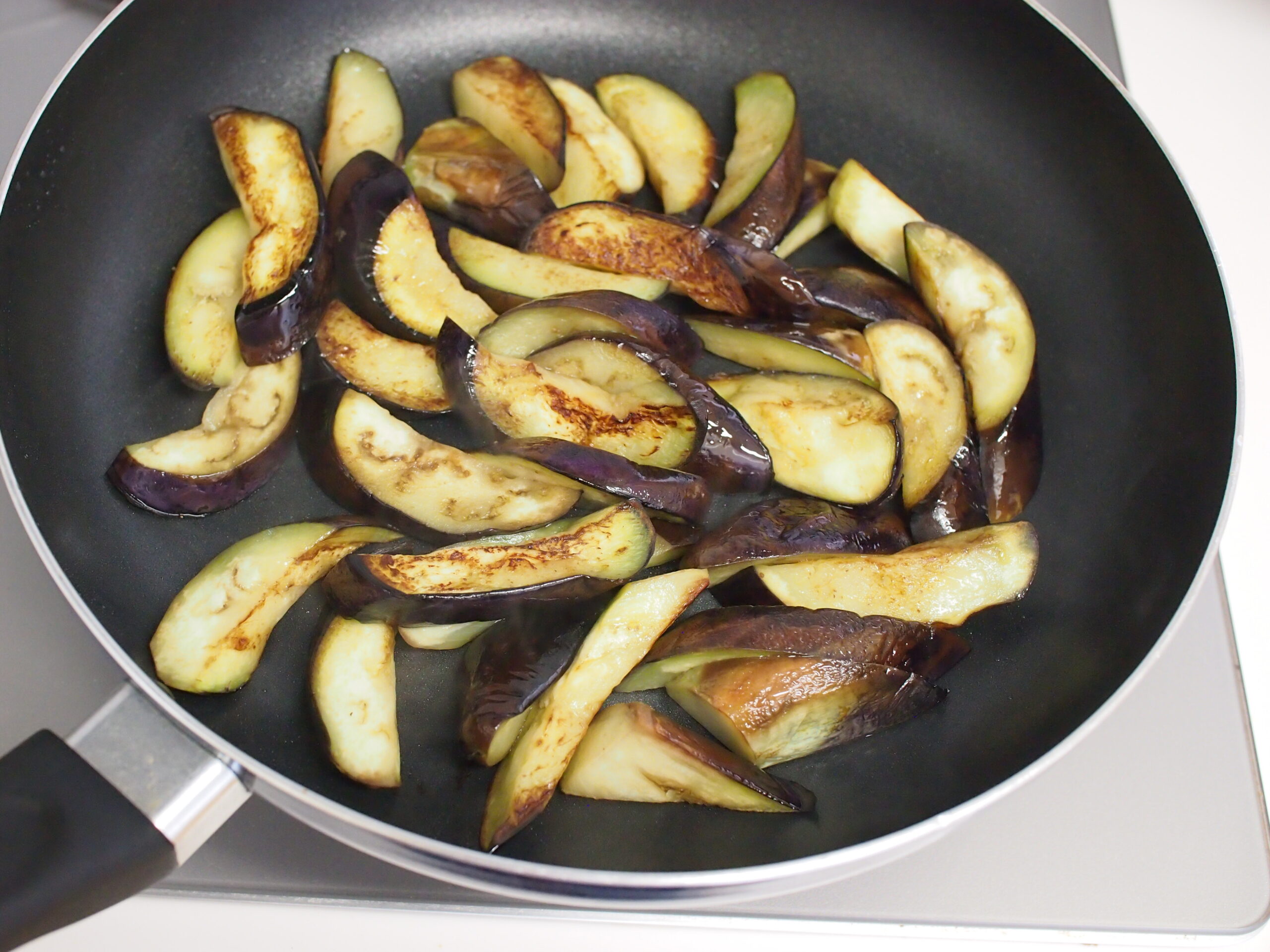 ②フライパンにサラダ油大さじ2を熱し、なすを入れて中火で焼き、蓋をして3〜4分少ししんなりするまで蒸し焼きにして皿にとる。