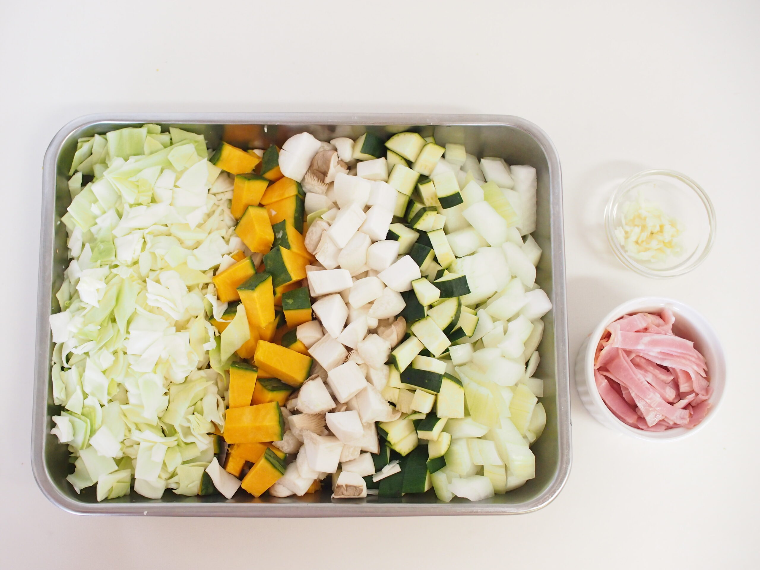 ①にんにくは薄切りかみじん切りにする。それ以外の野菜はすべて1.5cm角くらいに切る。ベーコンは細切りにする。