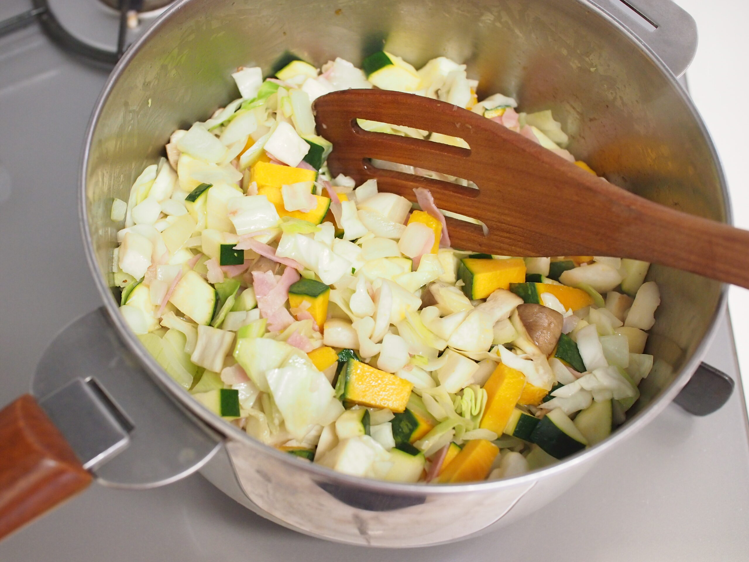 ②鍋にオリーブオイルとにんにくを入れ、中火にかけて香りを出し、玉ねぎとベーコンを加えて炒める。玉ねぎが透き通ってきたら他の野菜をすべて加え、しんなりするまで5~6分じっくりと炒める。