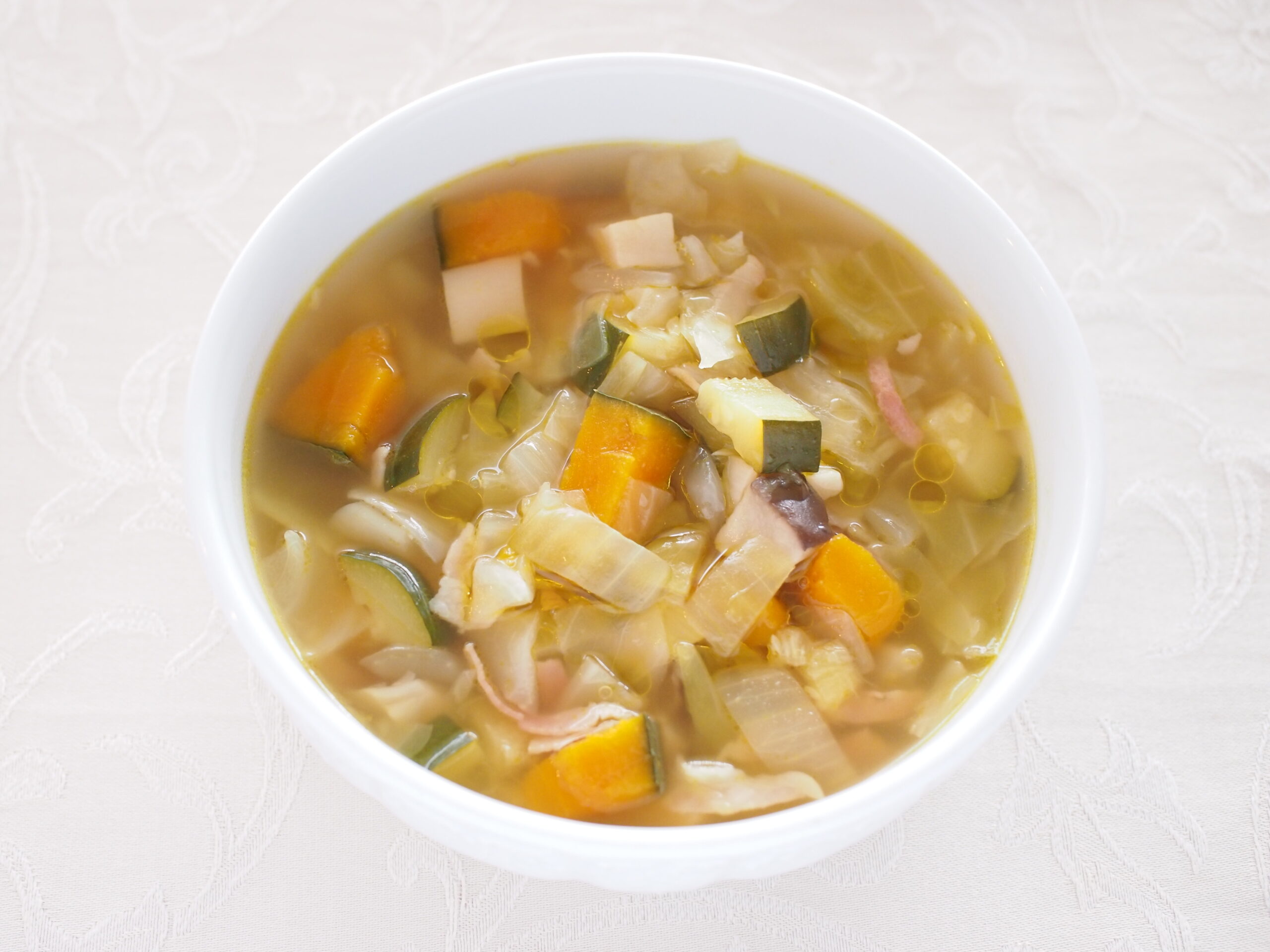 豆、パスタ、米を入れるレシピも多いですが、かぼちゃとベーコンで甘さとコクを出すのが私流。今回は加えていませんが、セロリ(葉も)を入れるのもおすすめです。
