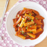 トッポギ(떡볶이)は、うるち米を原料とするお餅をコチュジャンベースの甘辛いたれでからめた韓国庶民の味。20年くらい前、ソウルに行ったときに屋台で食べた記憶があります。