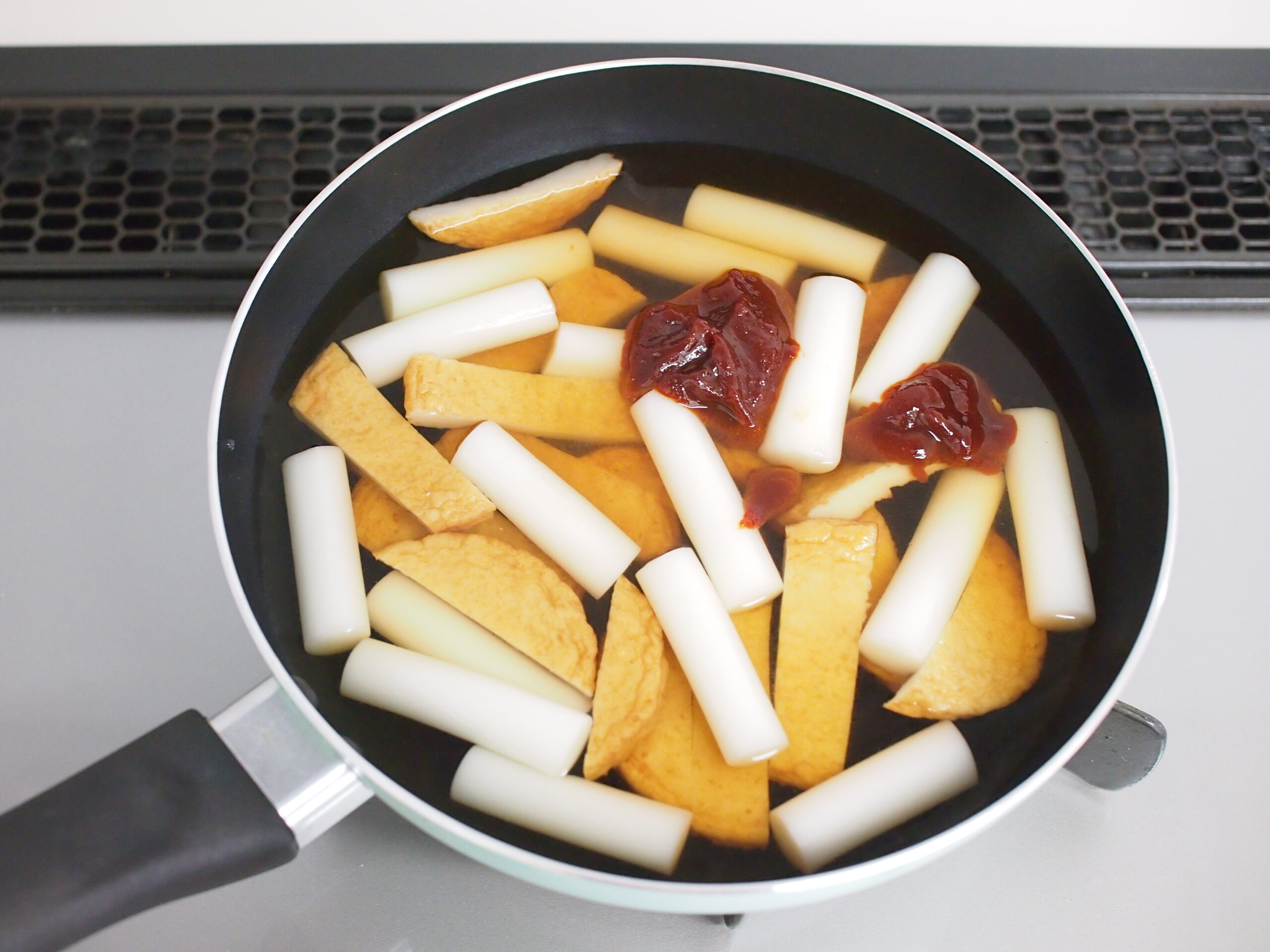 作り方は驚くほど簡単。トッポギは細く切った日本のお餅でも代用可能です。コチュジャンの量はお好みで加減してください。
