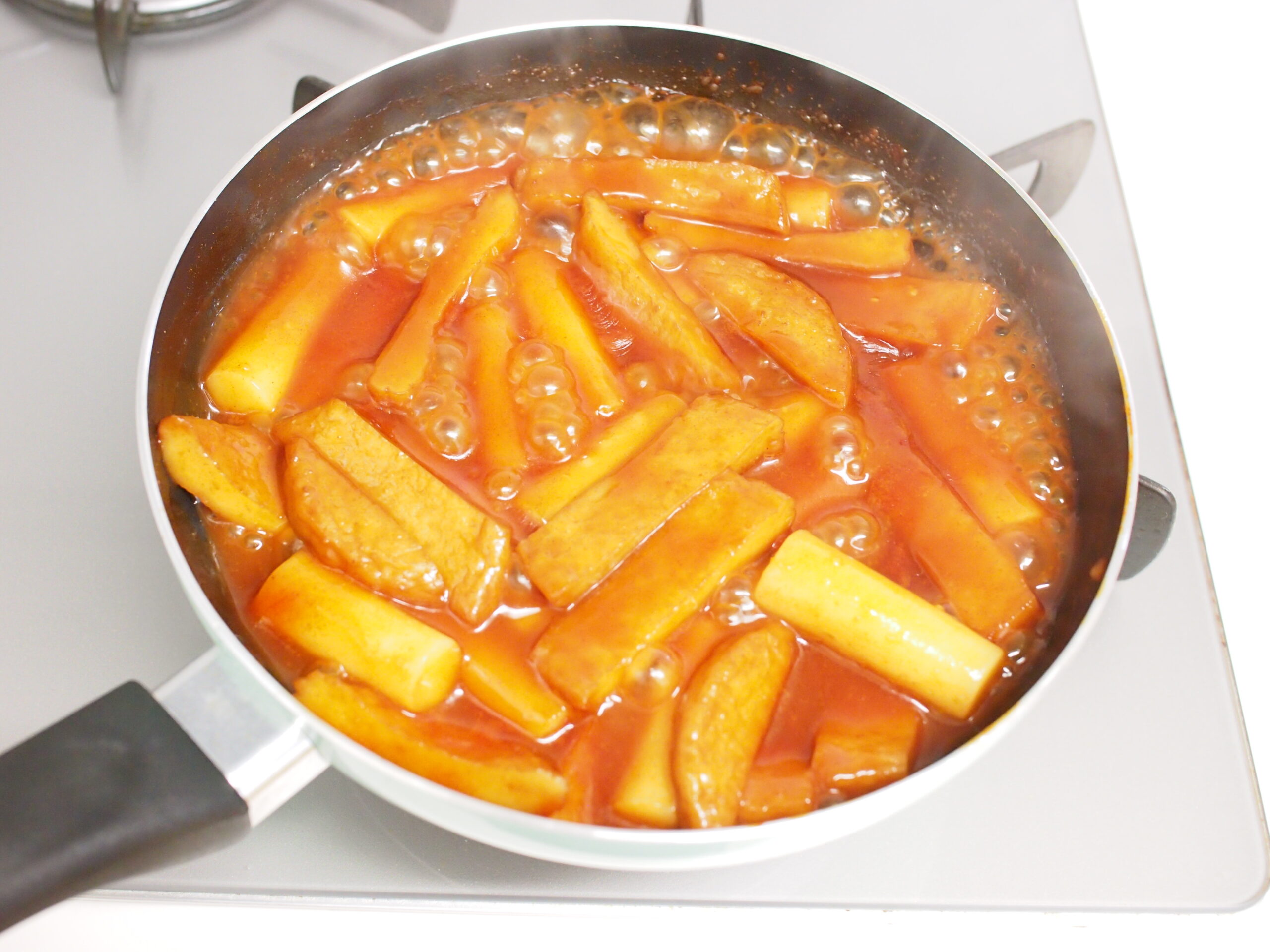 ①鍋やフライパンにトッポギ餅と1.5cm幅位に切ったさつま揚げを入れ、A)を加えて火にかける。